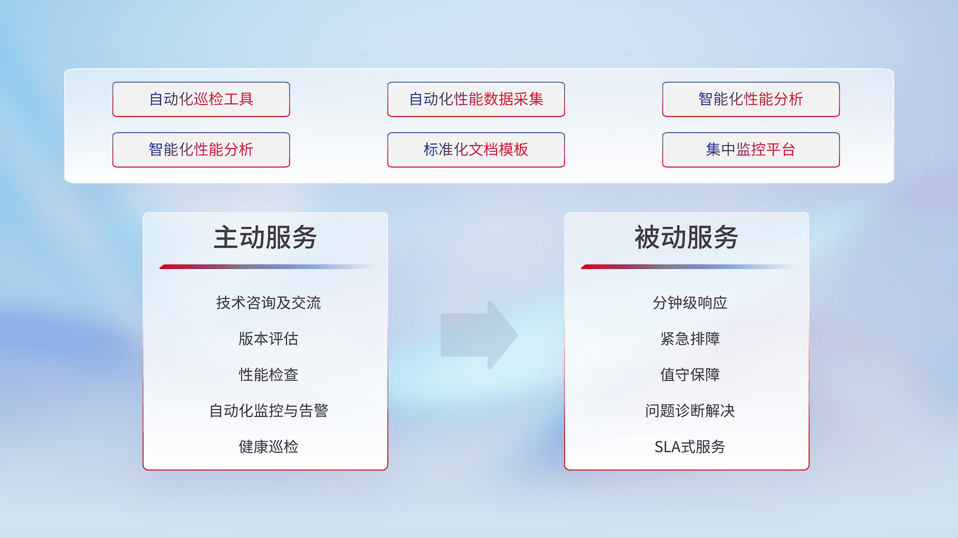 智能化工具和标准化文档,,,,保障服务质量,,,,提供主动服务(包含技术咨询、、、版本评估、、、、性能检查、、、、自动化监控与告警、、、、健康巡检)和被动服务包含(分钟级响应、、紧急排障、、、、值守保障、、、、问题诊断解决、、、SLA服务)。。